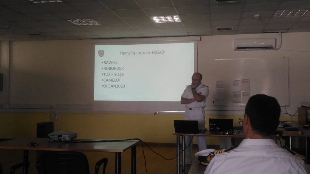 Μετά το πέρας της ανάλυσης των εργασιών στο ακαδημαϊκό προσωπικό, ακολούθησε αναλυτική παρουσίαση των ευρωπαϊκών προγραμμάτων CAMELOT, OCEAN2020, RAWFIE, ROBORDER και TOXI-TRIAGE από τον Τμηματάρχη Διαχείρισης και Παρακολούθησης Έργων της Διεύθυνσης Διαχείρισης Ευρωπαϊκών και Αναπτυξιακών Προγραμμάτων, Αντχο (Μ) Σπυρίδων Κίντζιο ΠΝ και ακολούθησε εποικοδομητικός διάλογος με τους δόκιμους της ΣΝΔ.